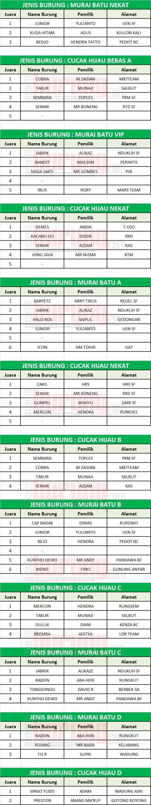 Seperti munculnya nama Jabrix di kelas Murai batu minggu kemarin, burung milik Alikaz asal Dukuh, kali pertama juara satu dikelas VIP, menyingkirkan banyak lawan tangguh. Main kedua di kelas Murai Batu A, Jabrix berhasil digeser oleh Karpetz milik Arry Tikus dari Regel SF. Main kali ketiga di kelas Murai Batu C, Jabrix kembali unjuk kebolehan dengan melibas lawan tanpa ampun. Sehingga burung muda yang baru menaiki jenjang prestasi berhasil nyeri juara satu dan sekali juara dua.