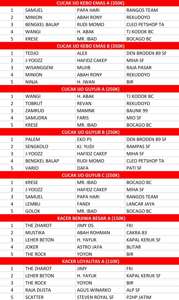Sedangkan di kelas lainnya yaitu Cucak Ijo, Kacer dan Cendet juga menyuguhkan aksi yang tidak kalah serunya. Di masing – masing kelas menunjukkan persaingan sengit. Berikut tim kontesburung.com mengulas secara lengkap burung – burung yang berhasil meraih juara di Ngobar Bolo SGS.
