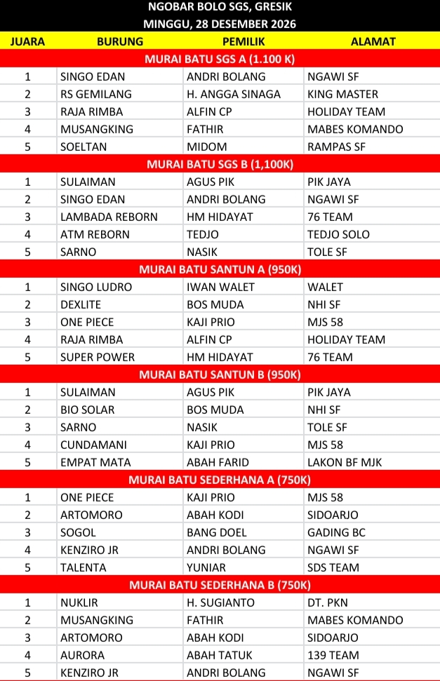 Di kelas utama yaitu Murai Batu SGS A, penampilan burung – burung berlebel bintang yang sarat prestasi saling tunjukkan performa terbaiknya yang membuat suasana lomba terdengar saling adu materi burung – burung jagoan. Alhasil, Singo Edan milik Ndan Andri Bolang dari Ngawi SF sukses meraih gelar jawara.