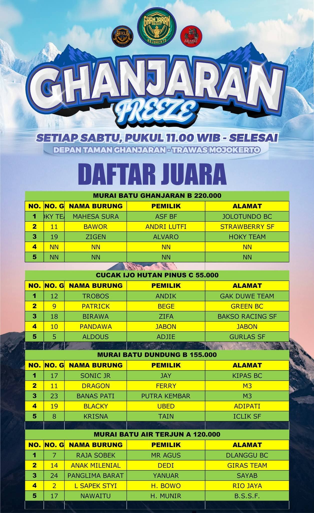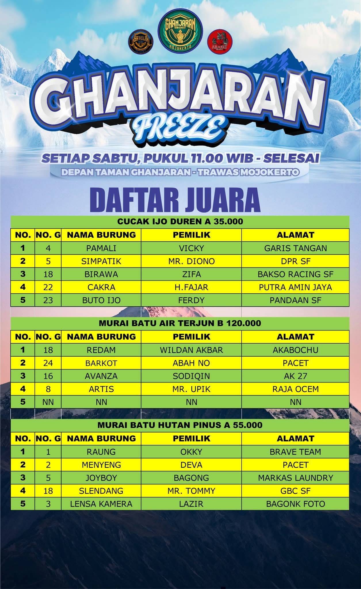 Seperti pada gelaran Ghanjaran Freeze pada hari Sabtu kemarin (07/02), banyak burung Besutan Baru yang sukses raih gelar juara dan juga banyak pencari bakat yang menanyakan apakah boleh di pinang.
