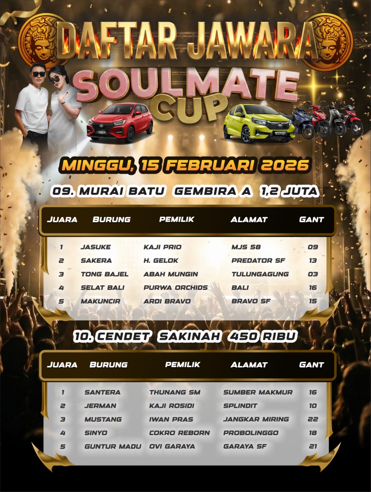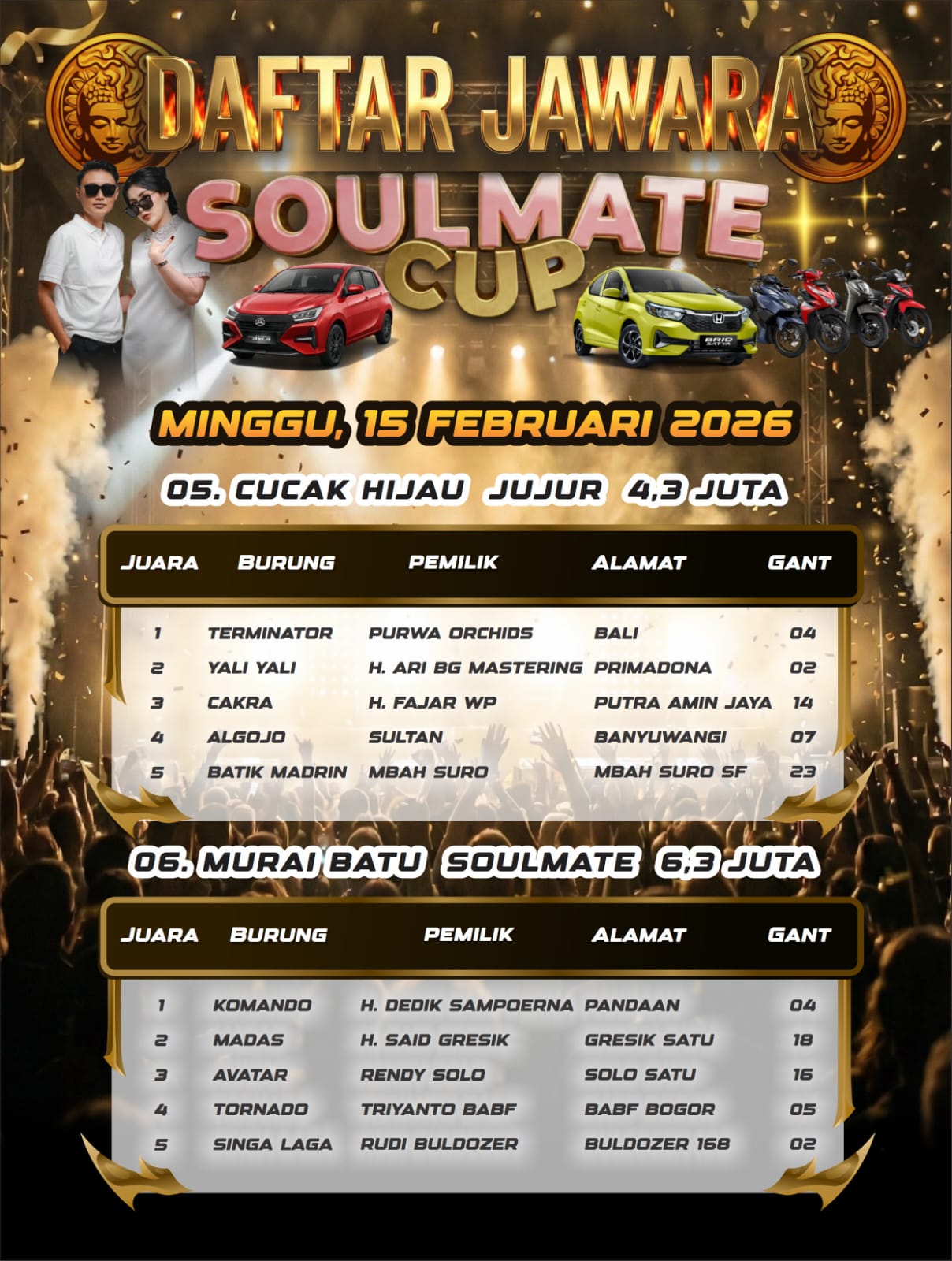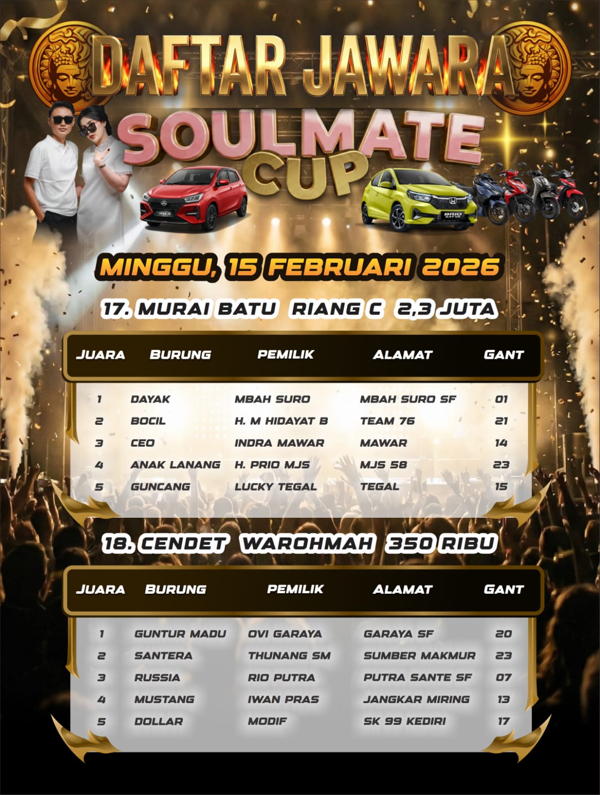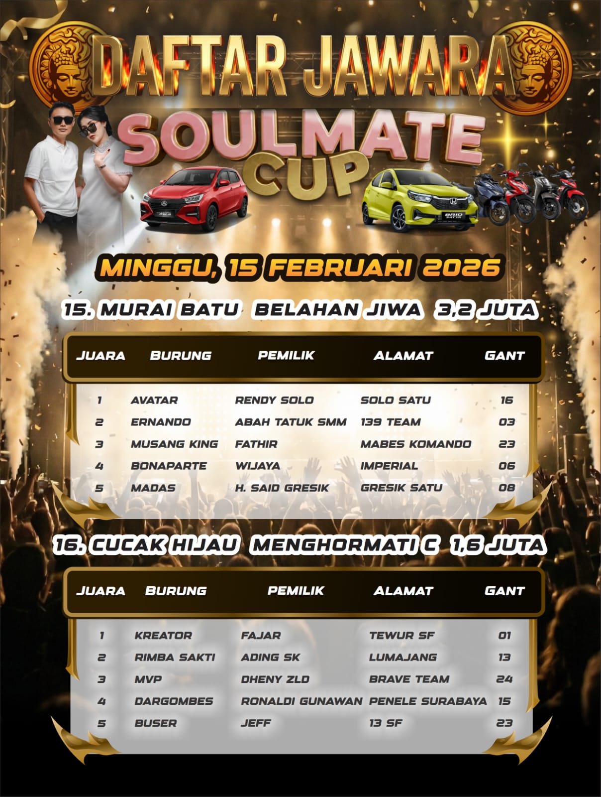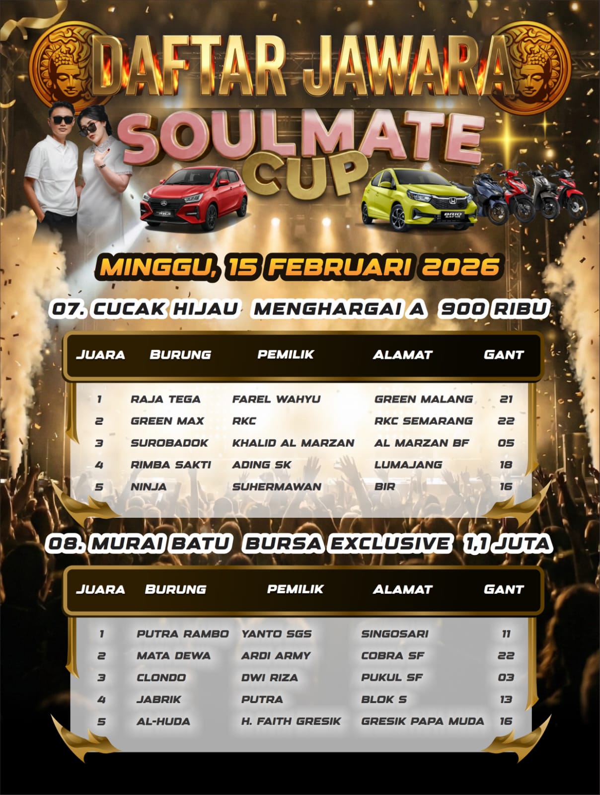 Di kelas Murai Batu Soulmate, ini adalah kelas utama dengan hadiah 1 unit mobil Honda Brio. Burung papan atas saling adu kemampuan terbaiknya yang membuat arena lomba terjadi pertarungan sengit.