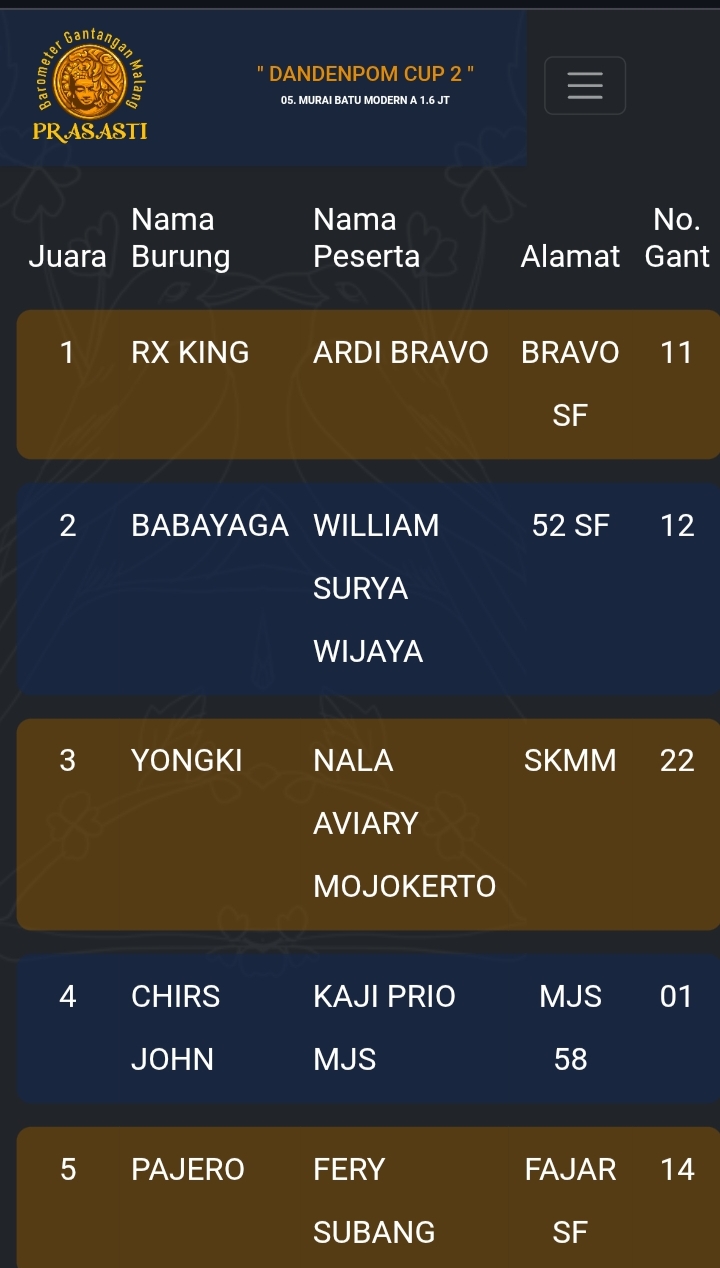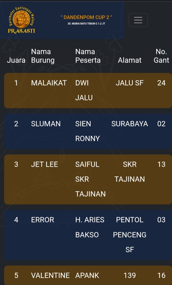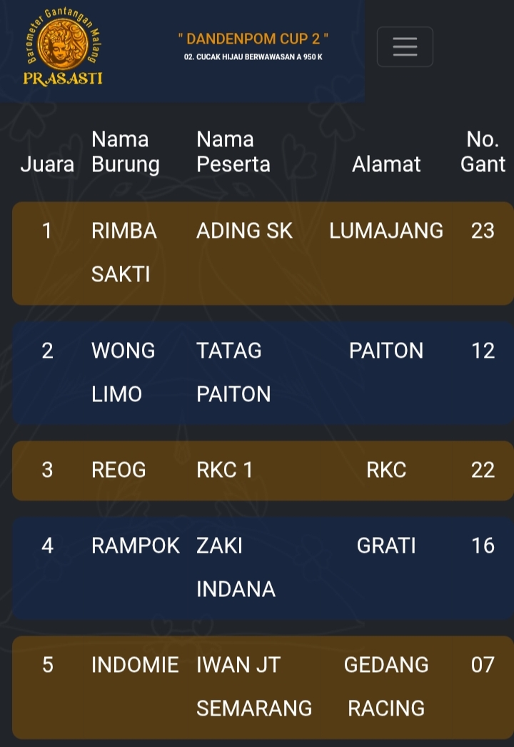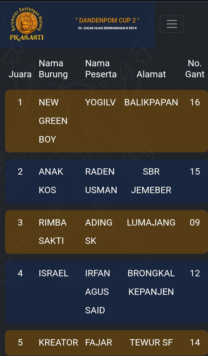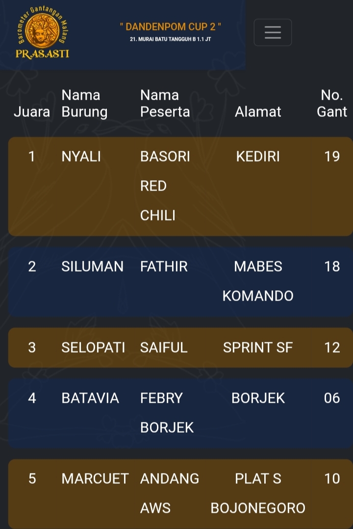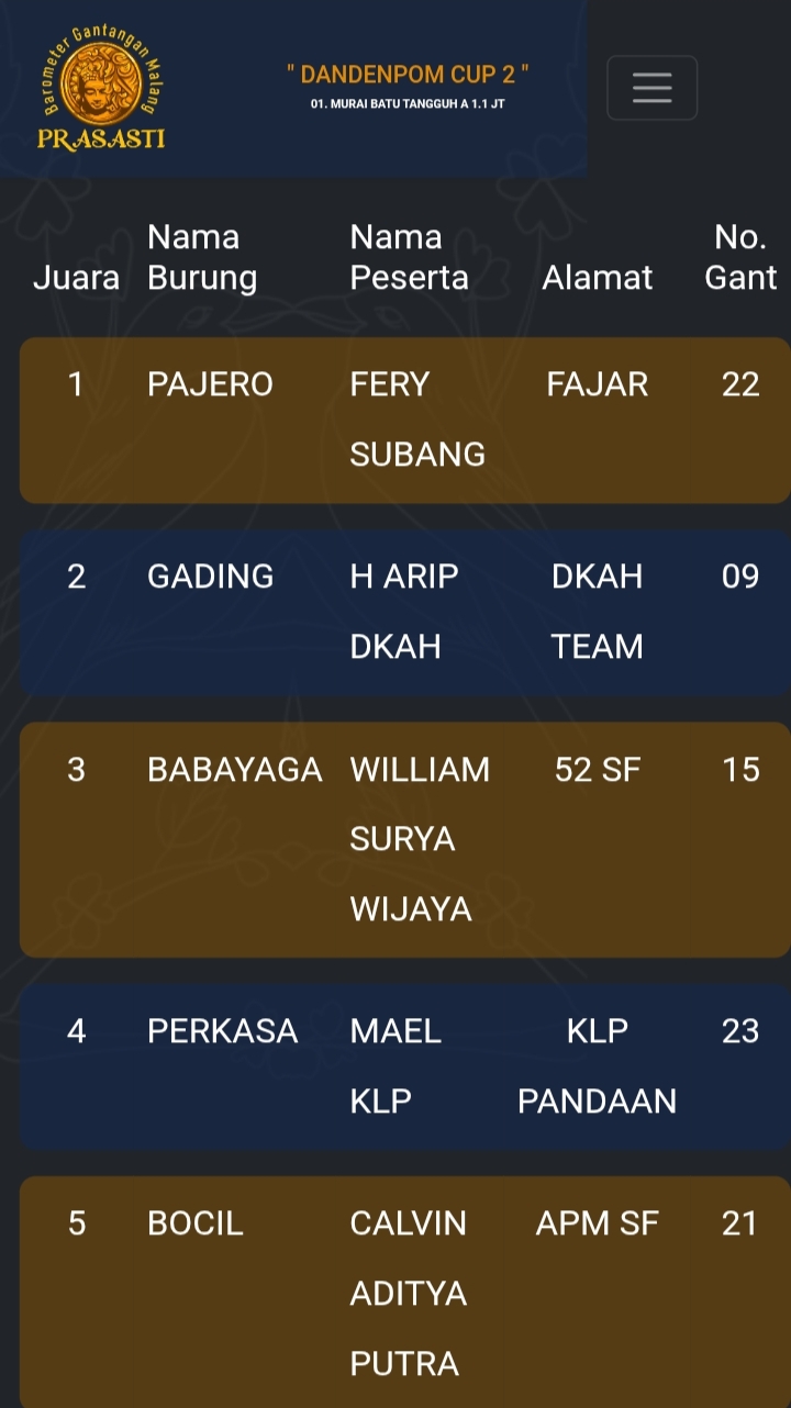 Gelaran prestisius kembali di gebyar gantangan Prasasti pada Minggu kemarin dengan tajuk Dandenpom Cup 2 (16/11) yang dihadiri kicau mania seantero negeri.