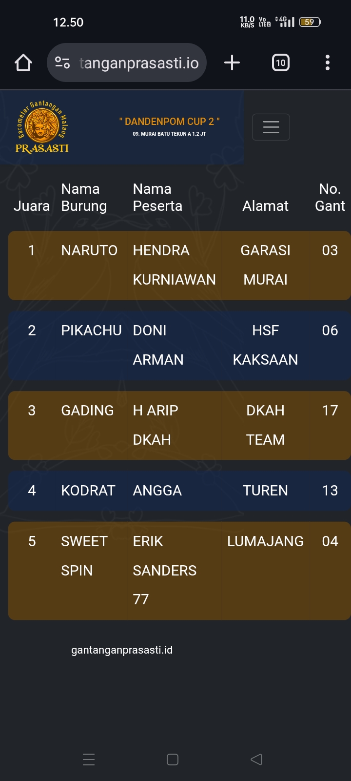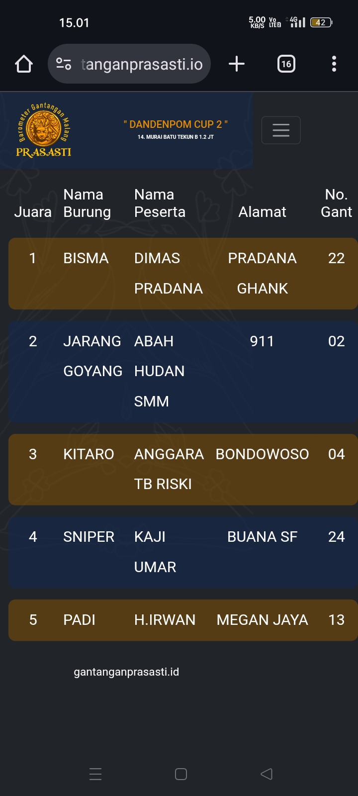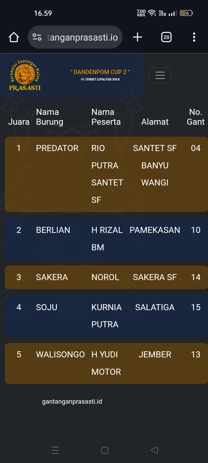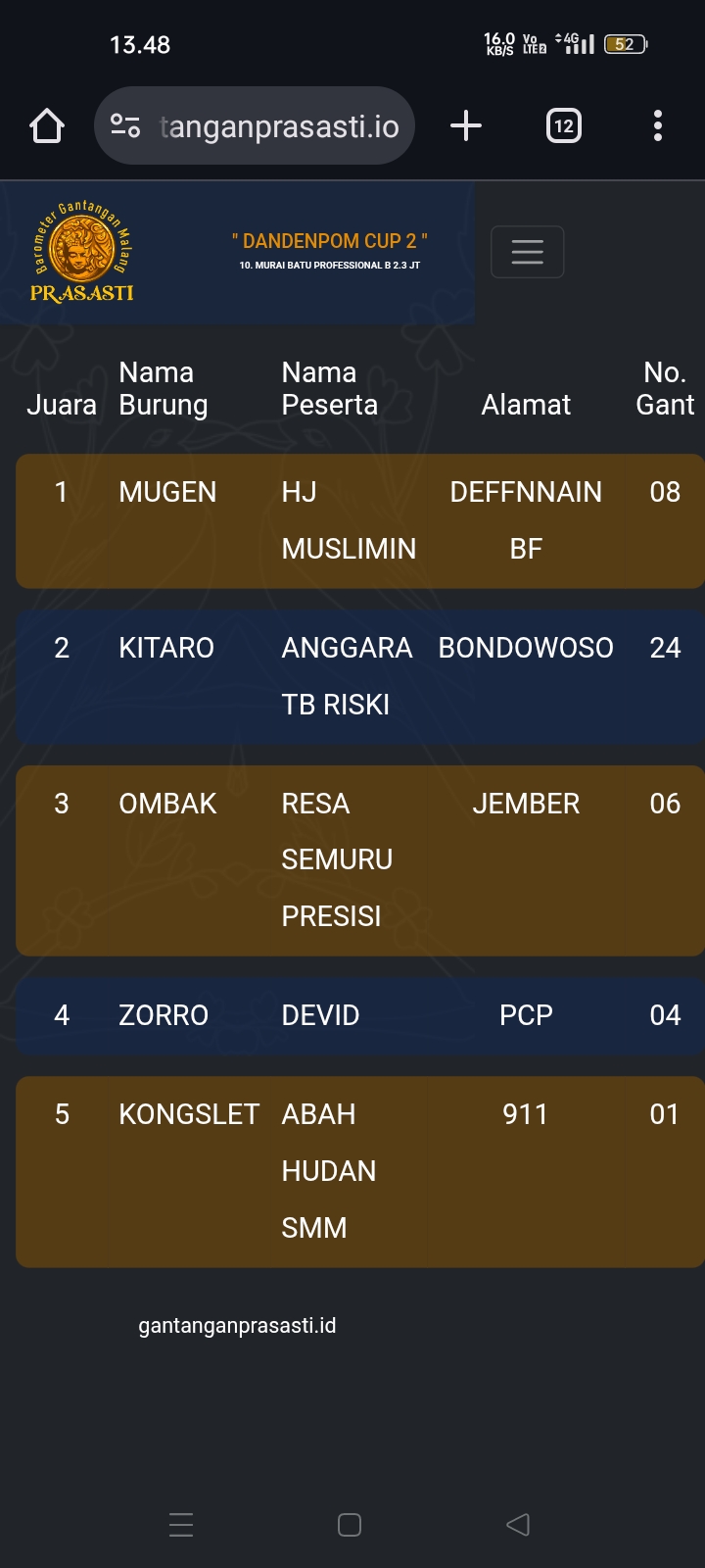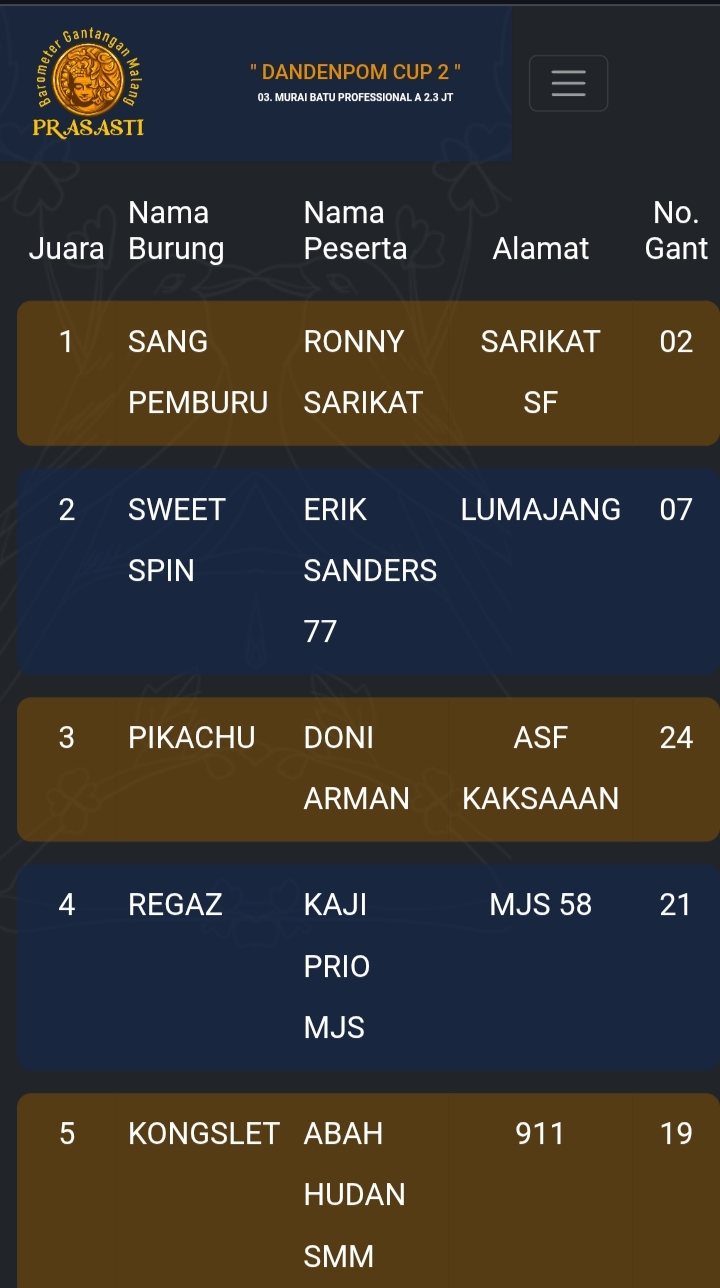 Gelaran prestisius kembali di gebyar gantangan Prasasti pada Minggu kemarin dengan tajuk Dandenpom Cup 2 (16/11) yang dihadiri kicau mania seantero negeri.