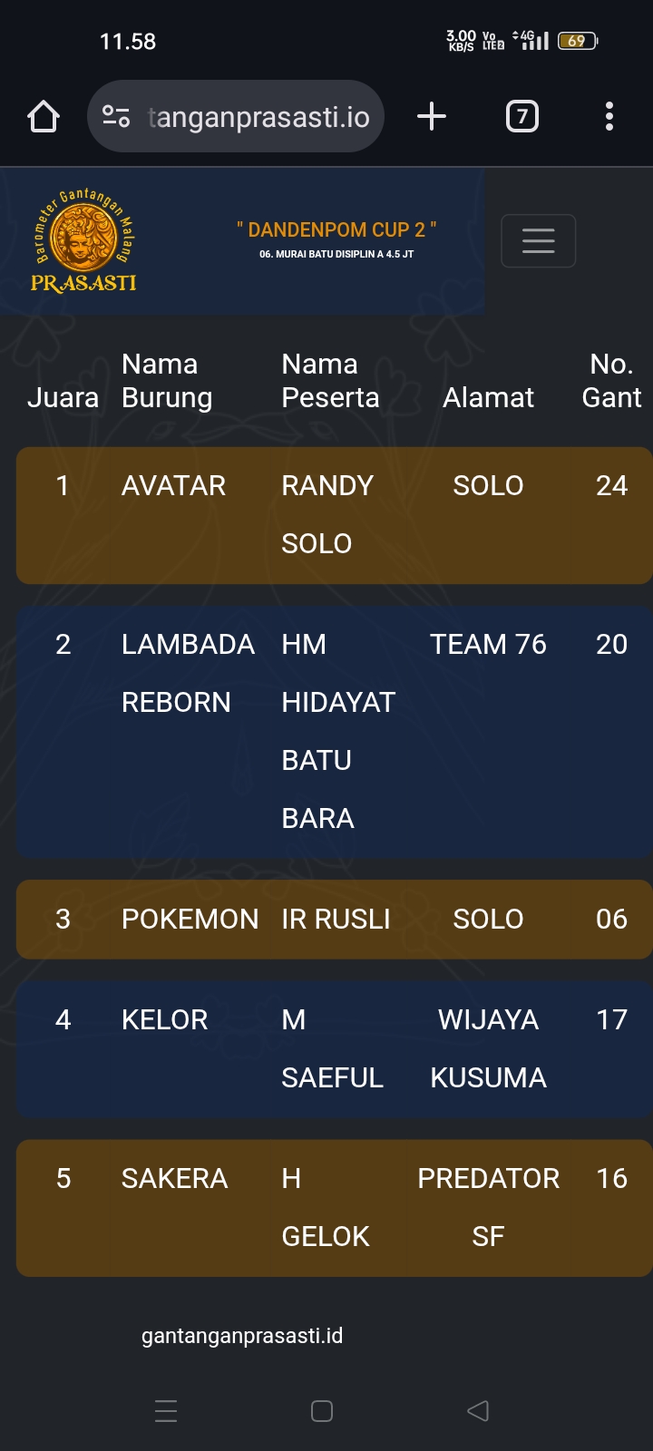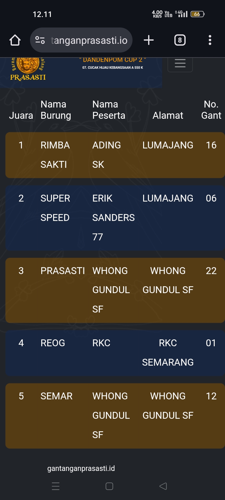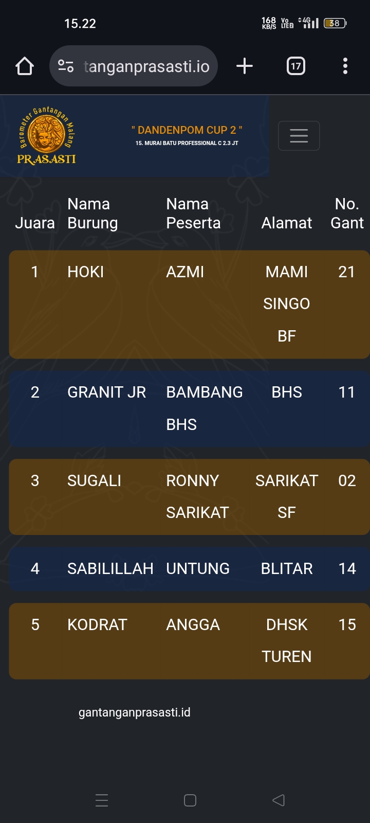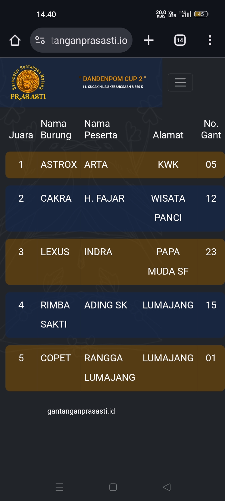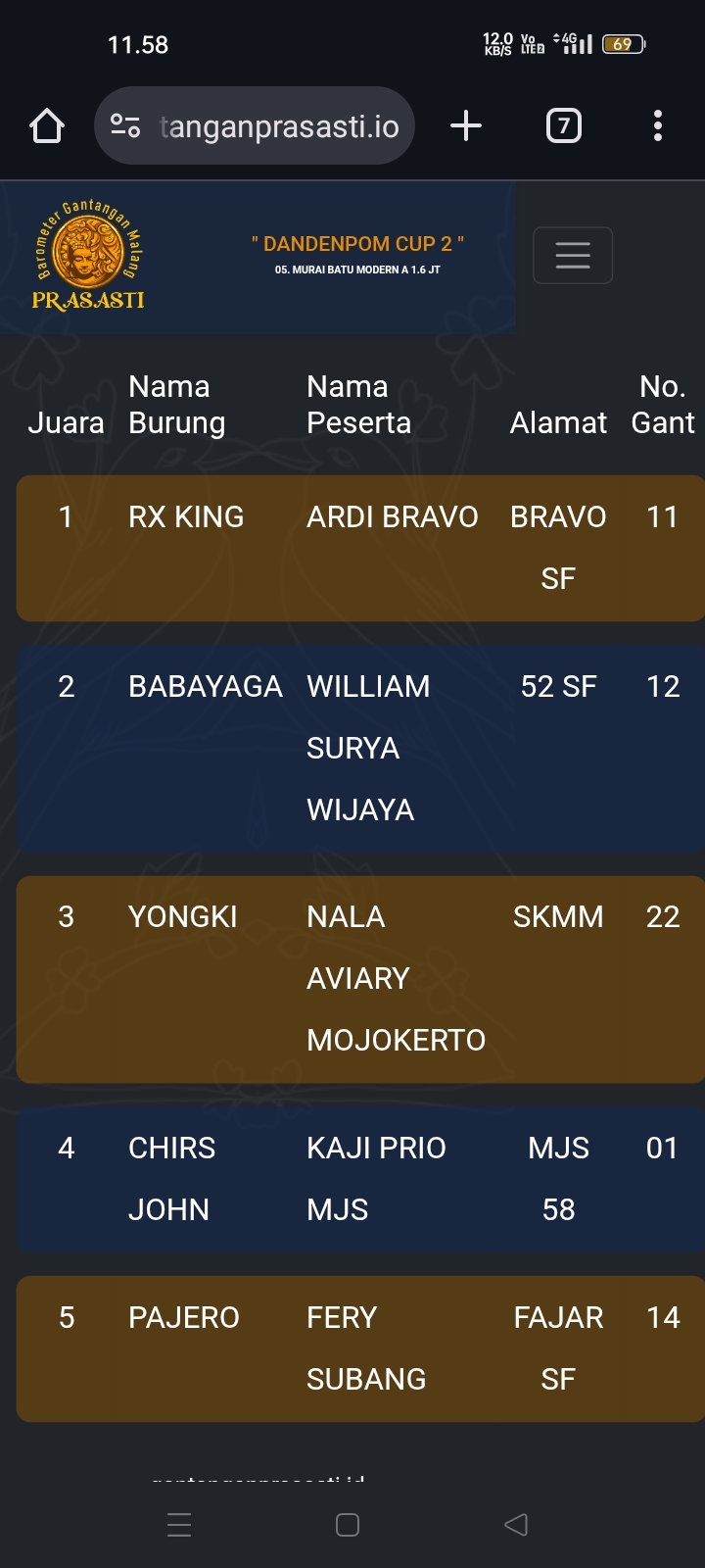 Gelaran prestisius kembali di gebyar gantangan Prasasti pada Minggu kemarin dengan tajuk Dandenpom Cup 2 (16/11) yang dihadiri kicau mania seantero negeri.