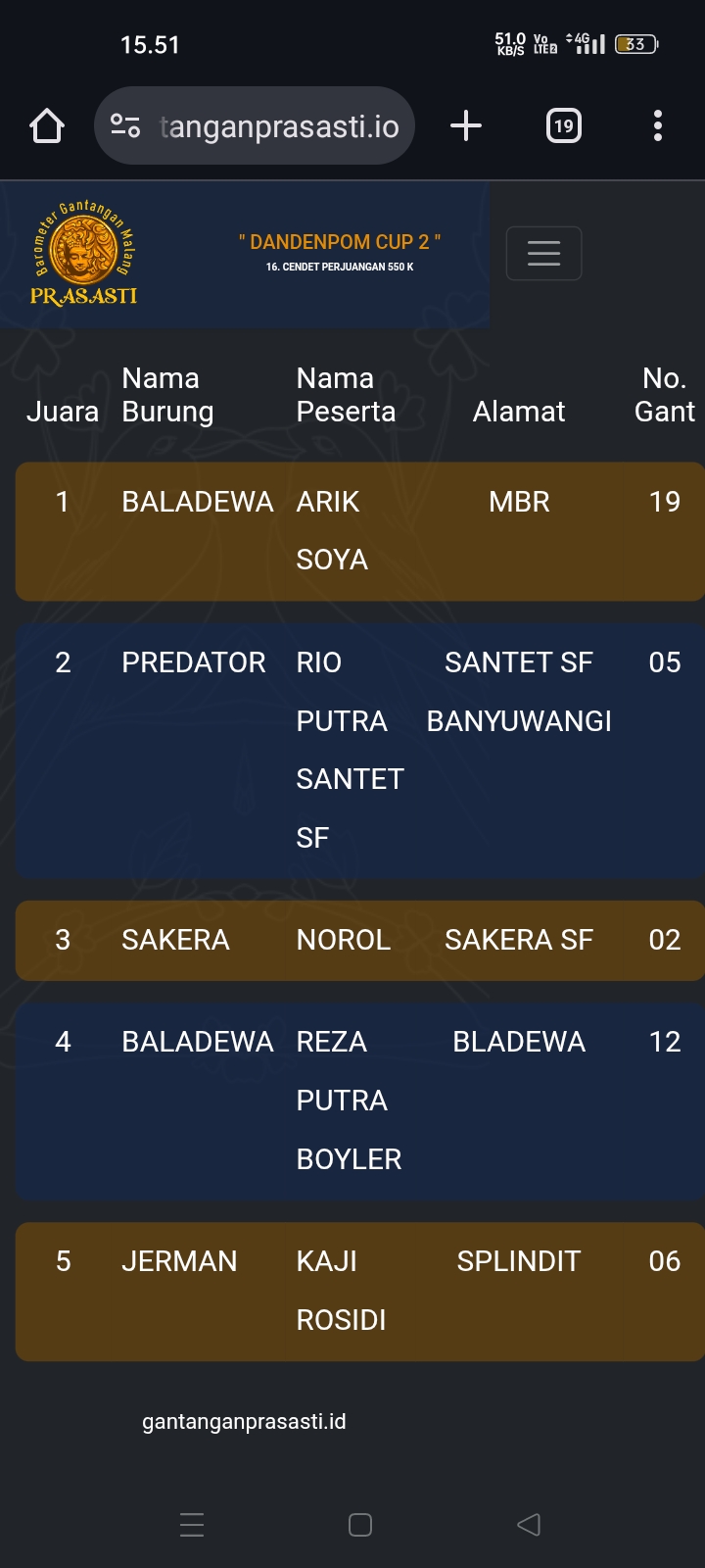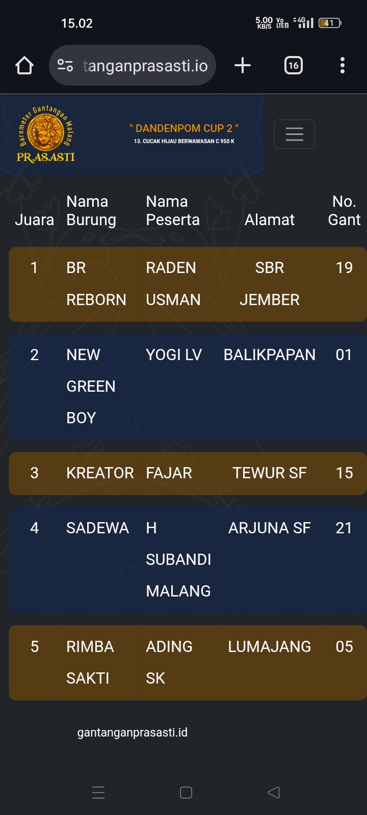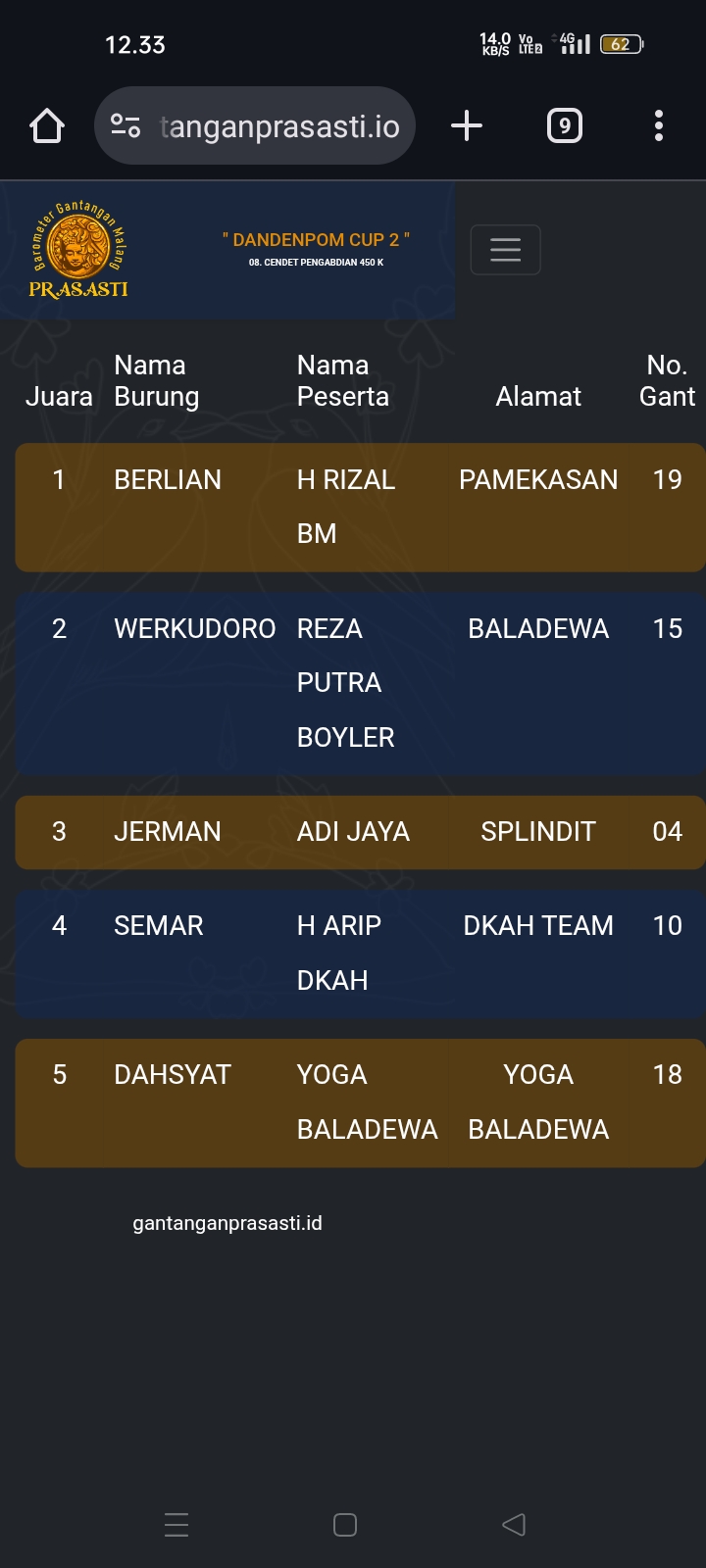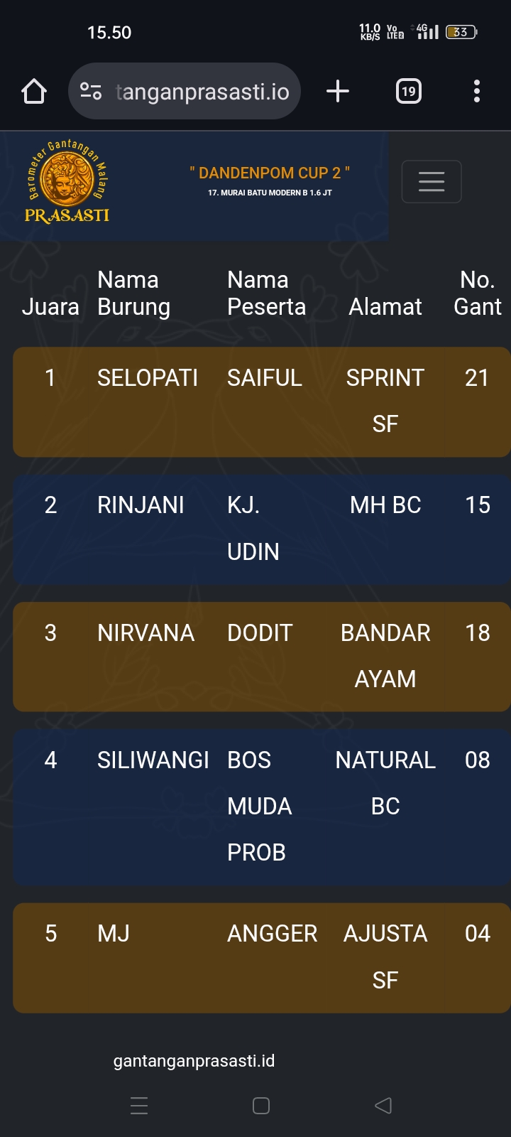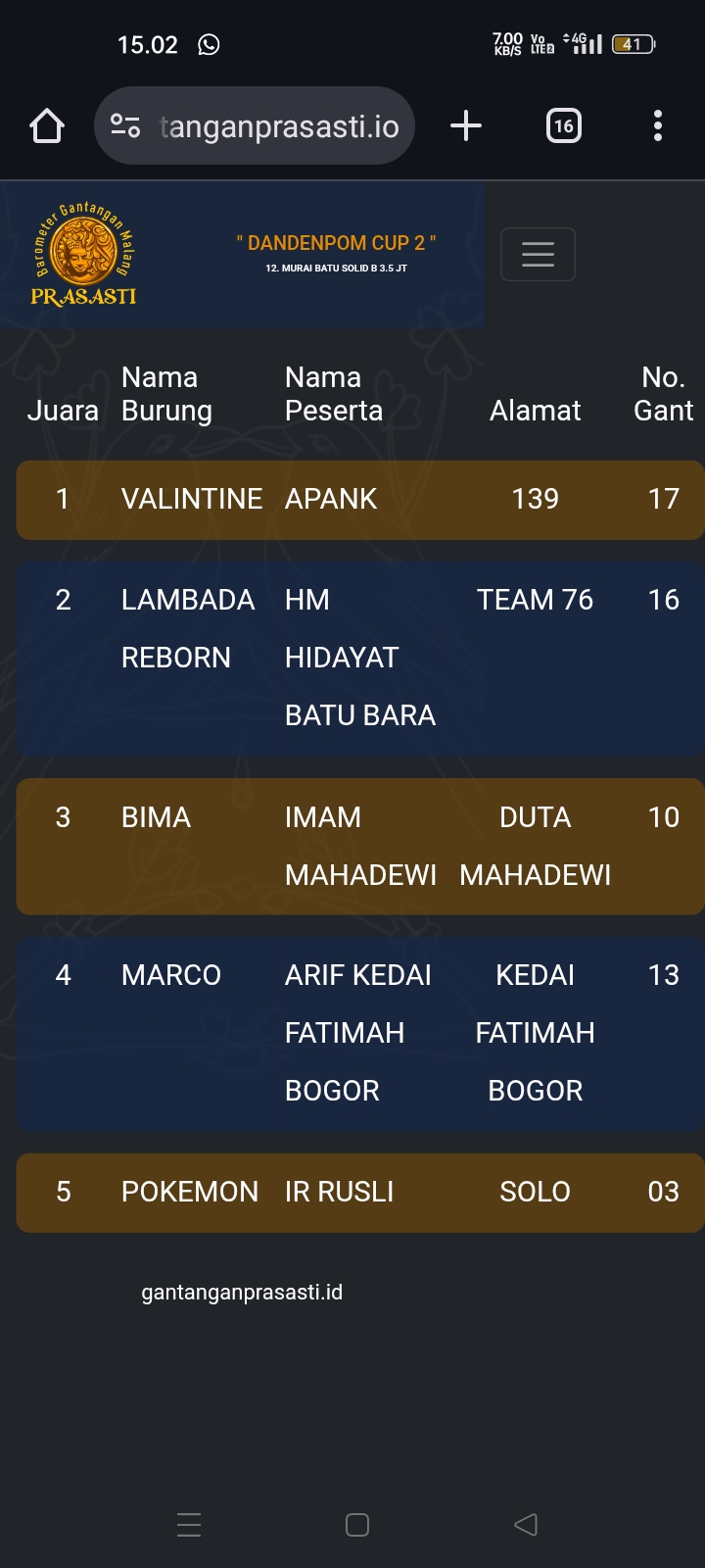 Gelaran prestisius kembali di gebyar gantangan Prasasti pada Minggu kemarin dengan tajuk Dandenpom Cup 2 (16/11) yang dihadiri kicau mania seantero negeri.