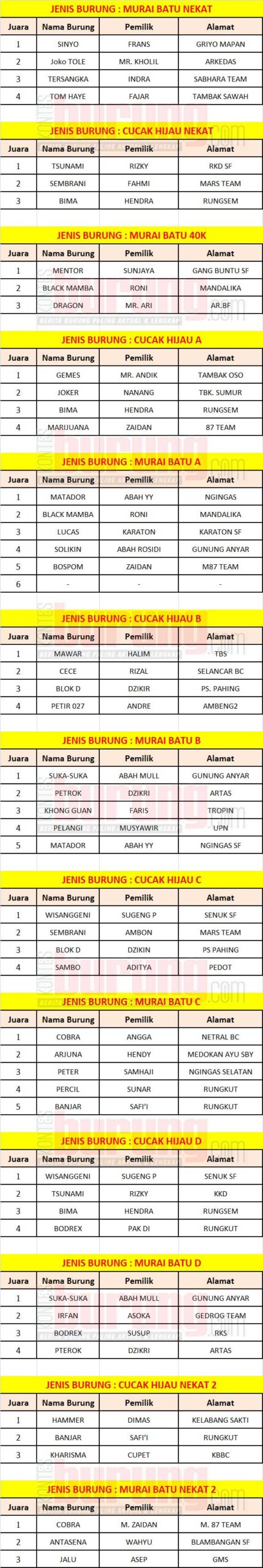 Salah satunya murai Suka Suka, burung jawara milik abah Mul beberapa bulan ini tidak muncul, begitu mencul langsung nyeri juara satu. Meskipun dua kelas murai, juara pertamanya digaet Suka suka, peluang debutan baru rebut juara pertamaesih terbuka, terbukti kelas Murai batu Nekat juaranya muncul nama Sinyo milik Frans asal Griyo Mapan. Lalu kelas Murai batu 40k juara pertama muncul nama Mentor milik Sunjaya asal Gang Buntu SF. Kemudian ada nama Matador yang juara pertama kelas Murai batu A dan lainnya.