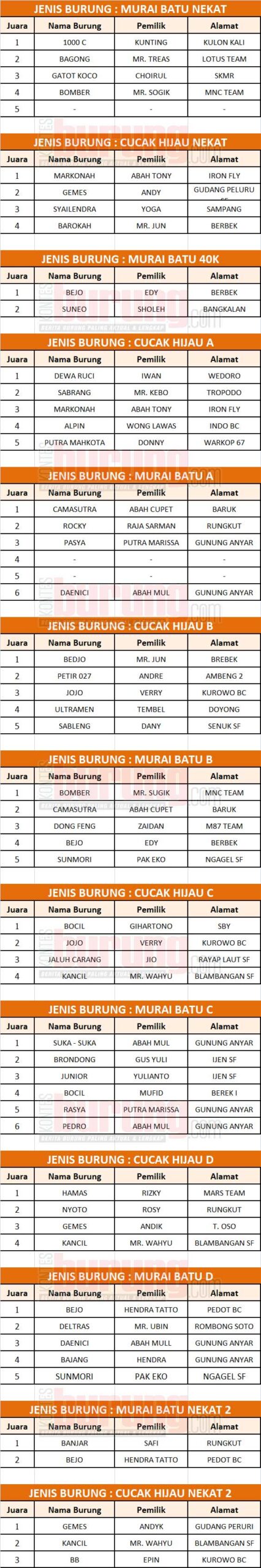 Seperti murai Bomber milik Sugik MNC Team yang juara pertama di kelas Murai Batu B, burung ini turun pertama hanya masih juara empat. Ada Kamasurta yang juara pertama dikelas Murai Batu A, disini turun peringkat jadi juara dua. Kemudian Bejo milik Edy Berbek yang juara empat, sebelumnya sempat juara satu dikelas Murai Batu 40K.