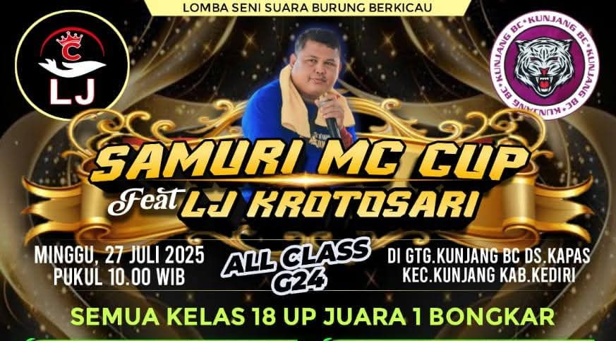 Kontesburung – Setelah lama ditunggu tunggu akhirnya lomba burung berkicau bertajuk MC kondang Samuri digelar kembali di Gantangan Kujang BC Ds. Kapas, Kec. Kujang, Kab. Kediri akhir bulan ini hari minggu tanggal 27 Juli 2025.